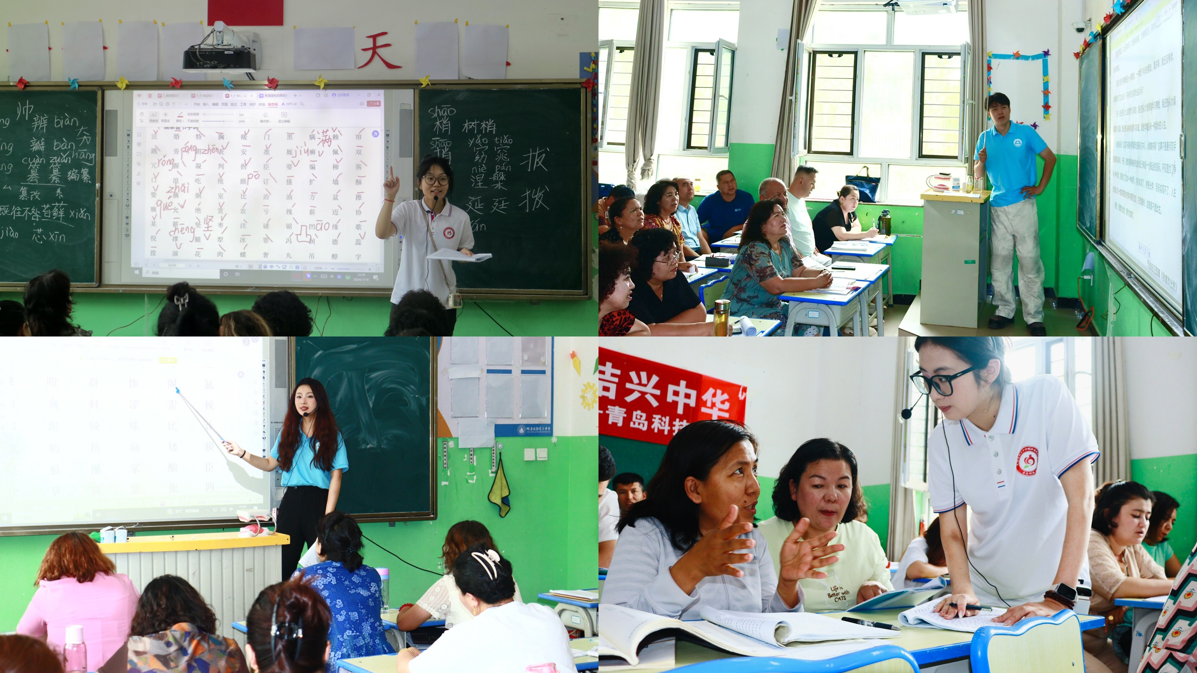 2024年暑期,学校“花开青科石榴红”推普支教实践团响应全国大学生“返家乡”社会实践“大国边疆 青春聚力”号召,赴新疆喀什疏勒县开展暑期社会实践活动。团队中有1名国家级普通话测试员,2名省级普通话测试员,12名助教,负责喀什疏勒县206名教师普通话培训工作。团队按照“抓住重点、盯紧关键,精准突破、巩固提升”的工作思路,充分发挥专业优势,立足促进各民族交往交流交融,创新实践方法、丰富活动载体,打造了“三强化两融合”实践模式,多措并举促进推普助力乡村振兴实践活动走深走实。所有队员克服水土不服等困难,以高度的责任感和使命感投入到推普活动中,全力践行橡胶品格,以社会实践架起民族交流的桥梁。