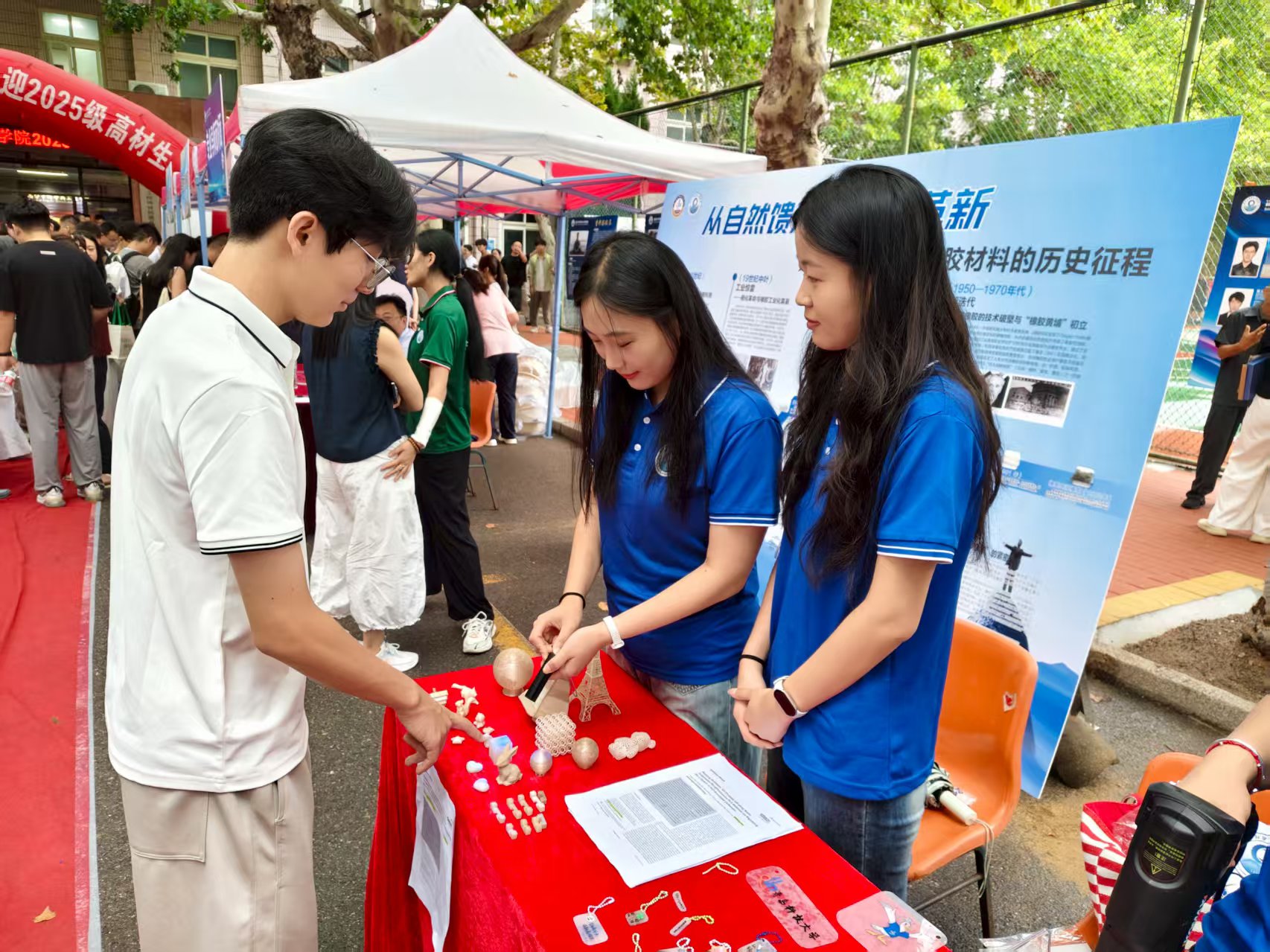 化学与分子工程学院以“青春‘化’时代,扬帆新征程”为主题,在迎新现场依据学科特色设计活动,以饱满的热情和体贴的服务迎接新生的到来。设计“你好,锌铜学!”主题喷绘拍照打卡点,营造热情的迎新氛围;“触碰化学,催化梦想”实验展演区,“蓝晶雨”“风暴瓶”等趣味化学反应吸引新生驻足体验;“指尖上的海洋馆”科普海洋知识,加强爱护海洋环境意识,真实的海洋标本让新生感受到海洋的魅力;设立师生面对面专岗、党员先锋岗、学生会志愿者等迎新服务队,传递科大温度,确保迎新工作高效有序。